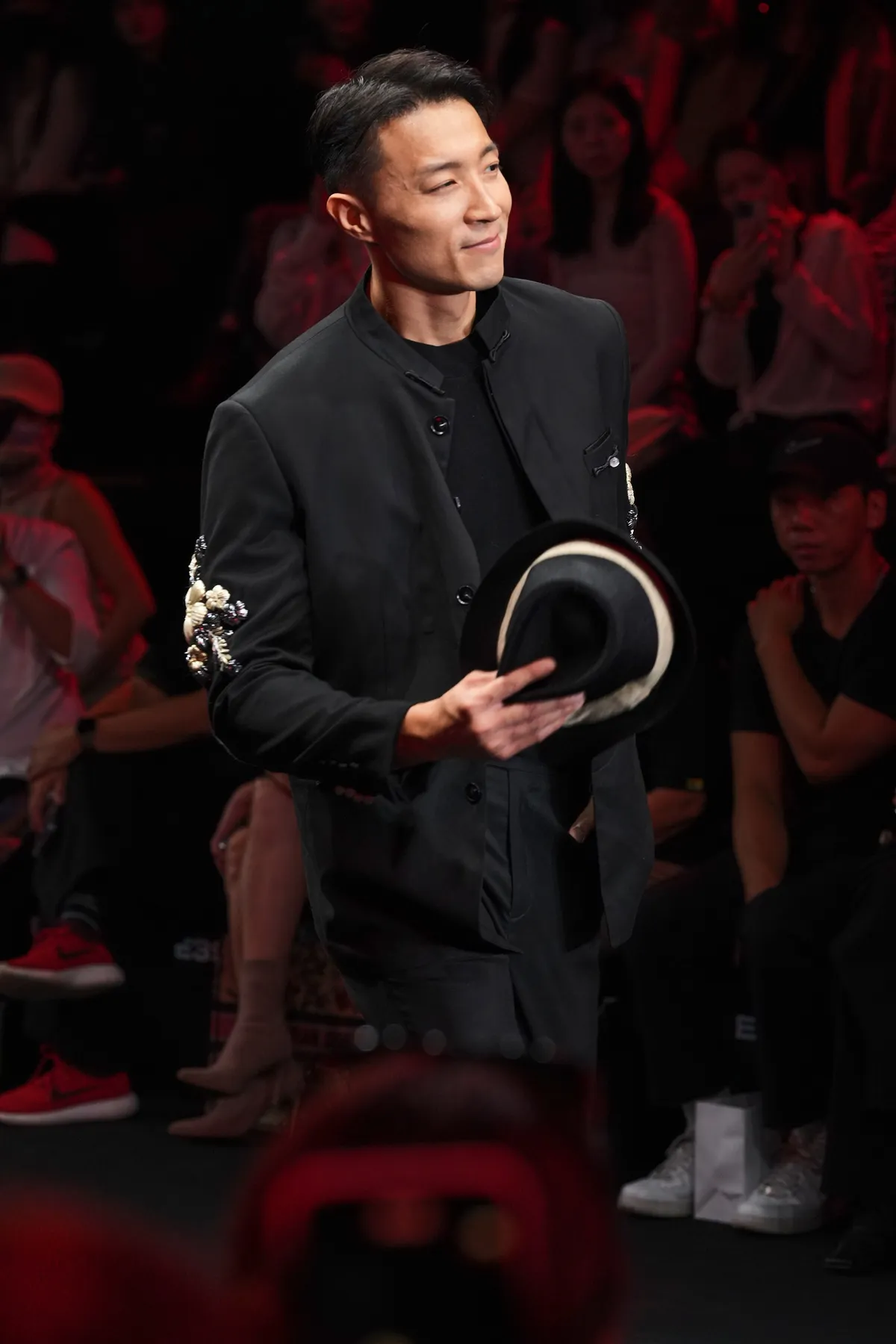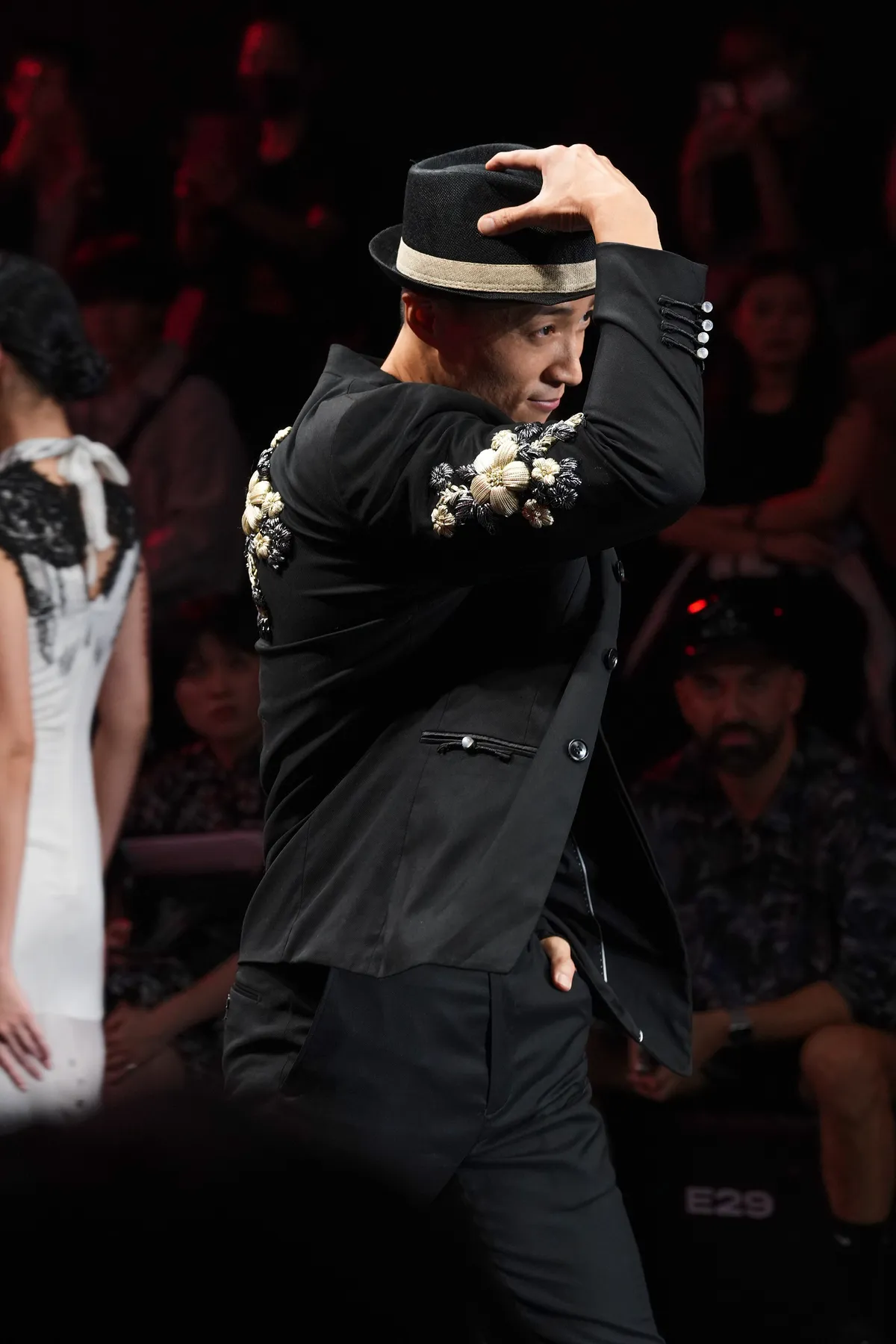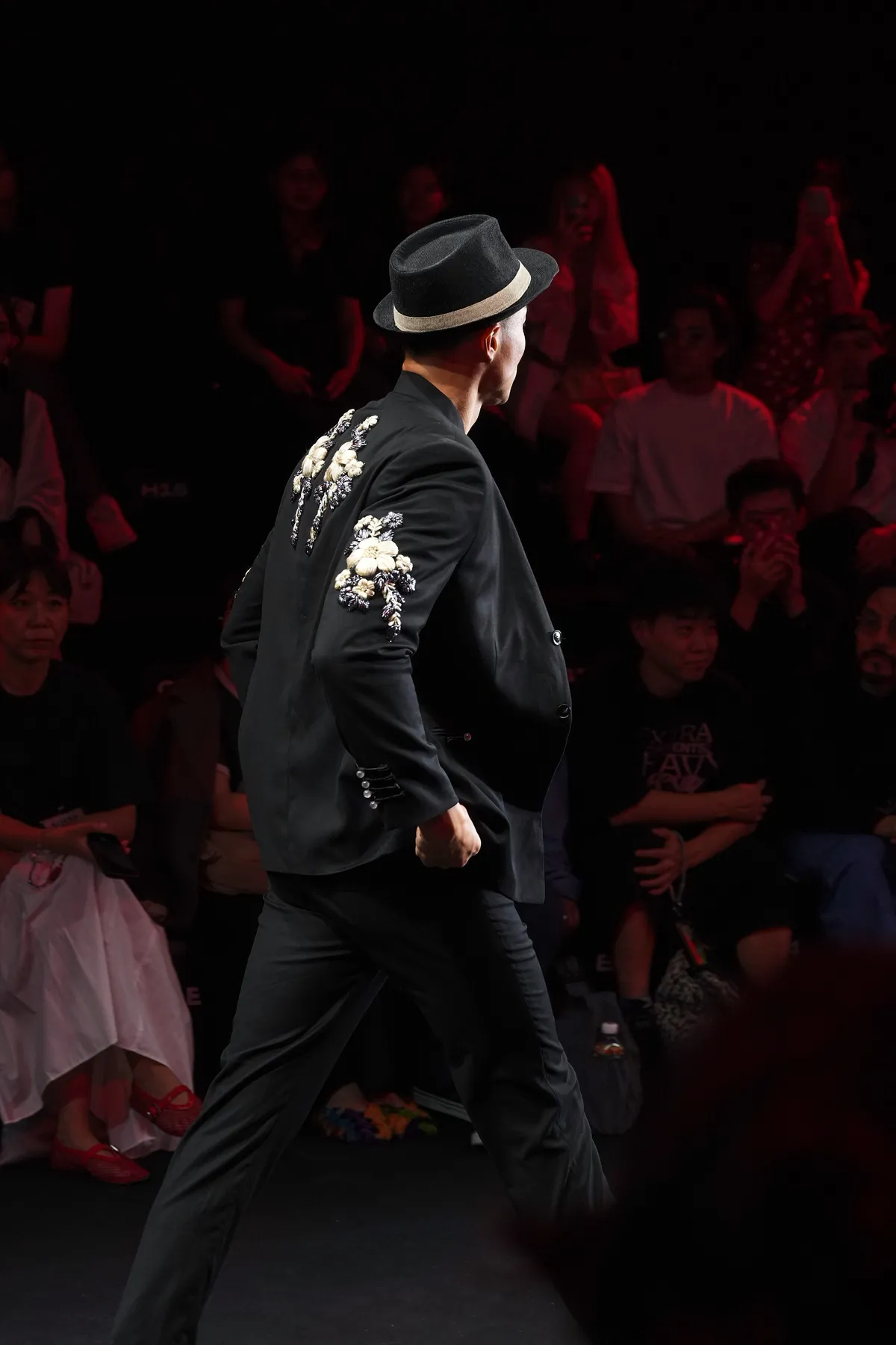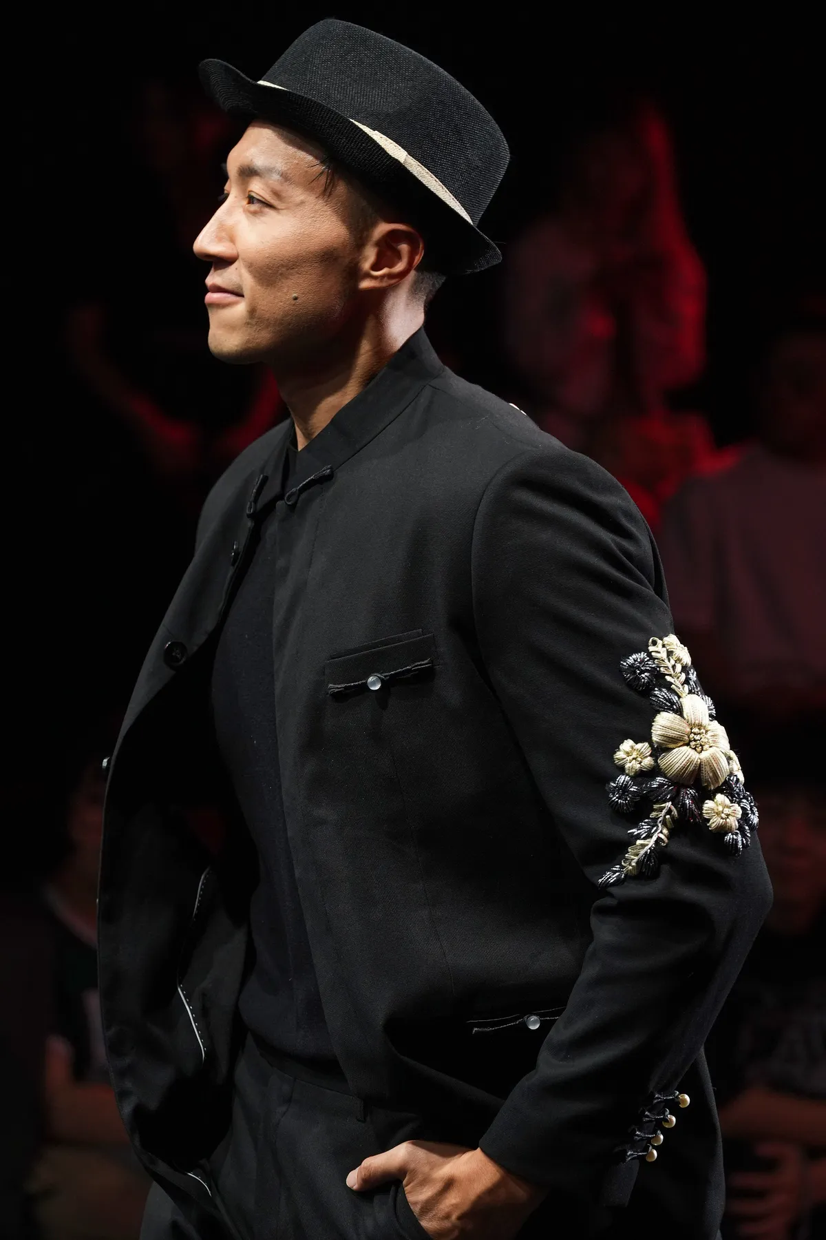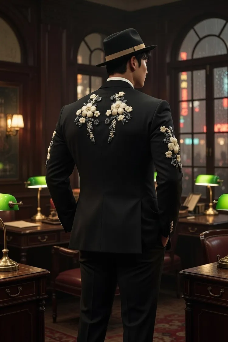 以早年臺灣男性的裝扮為靈感,於外套表面縫上以絲帶製作的刺繡,讓樸實的傳統形象在細膩紋理中重現,呈現低調而當代的東方韻味。