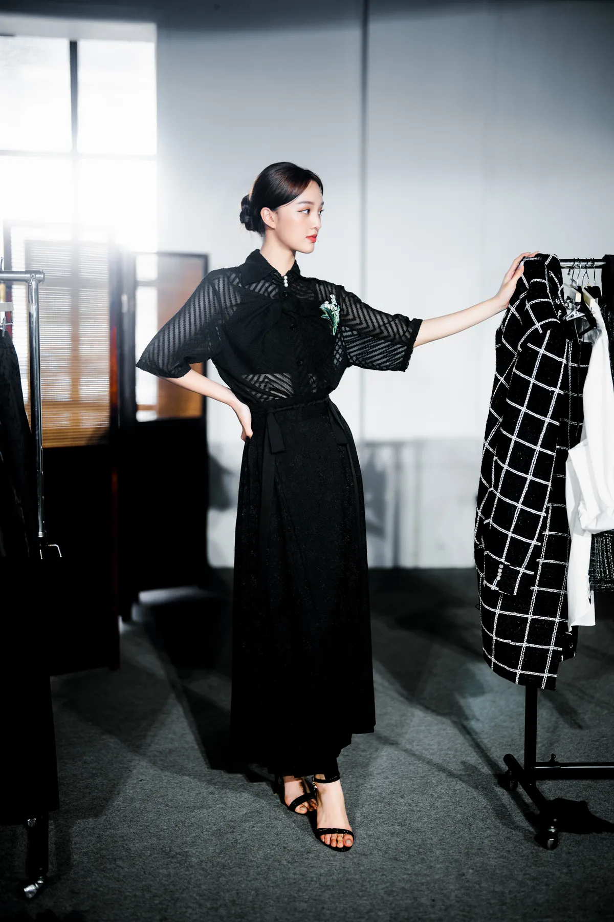 デザイナーは幼少期の思い出を振り返ります。おばあさんが肩に乗せて、ゆっくりと川辺へと向かい、洗濯をしていた光景。水面が優しく揺れ、衣服の裾が水に浸るその瞬間、流れる光と時の温もりが映し出されました。この記憶がインスピレーションとなり、デザインに繊細に織り込まれました。衣服に川のリズムが宿り、ひとつひとつの折り目や線が、あの温かく静かな時をささやくかのように感じられます。