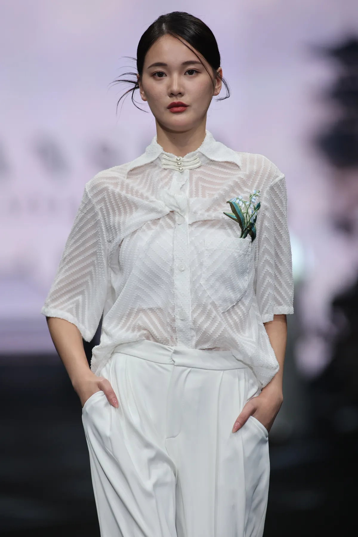 The designer recalls childhood memories of his grandmother carrying him on her shoulders, slowly walking towards the riverbank to wash clothes. The gentle ripples of the water, with the corners of the garments immersed, reflected the shifting light and the warmth of time. This memory became the inspiration, delicately woven into the design, allowing the garments to carry the rhythm of the river. Every fold and line seems to whisper the soft and distant echoes of that tender time.