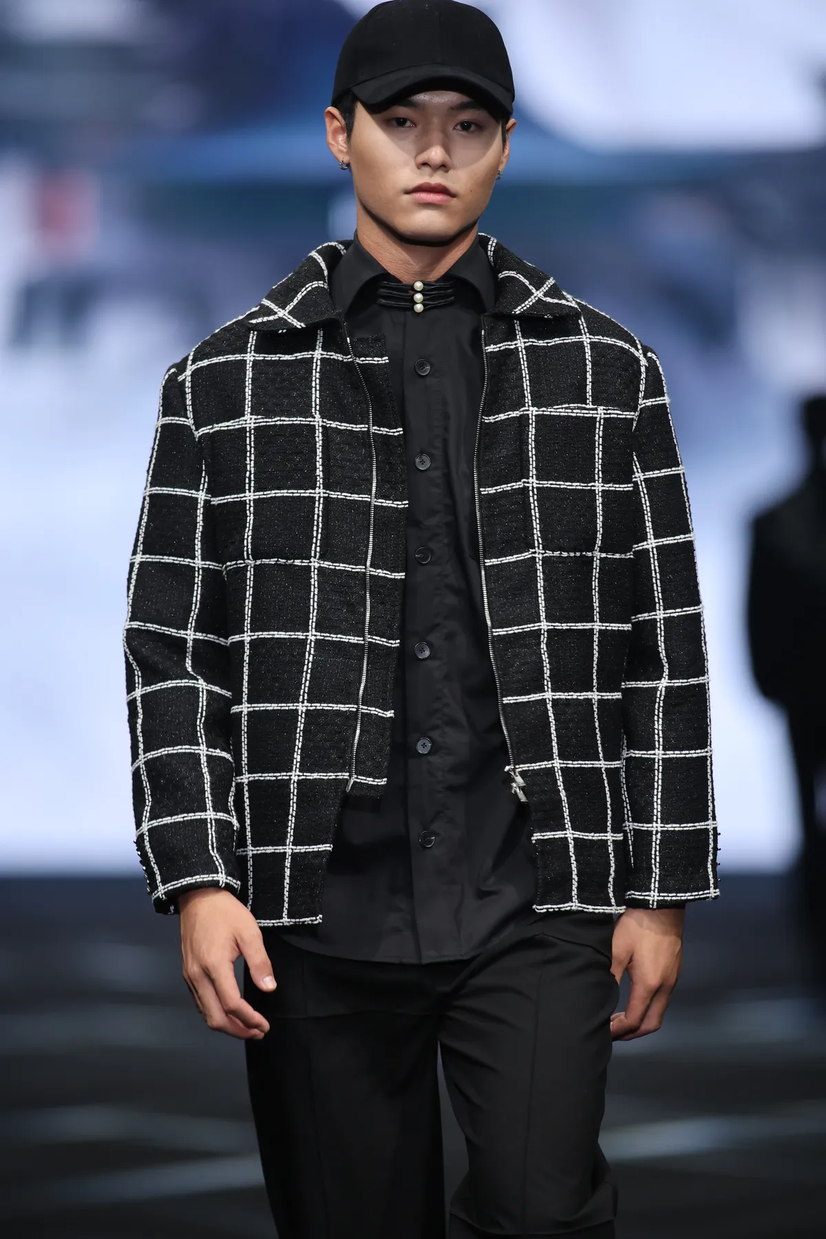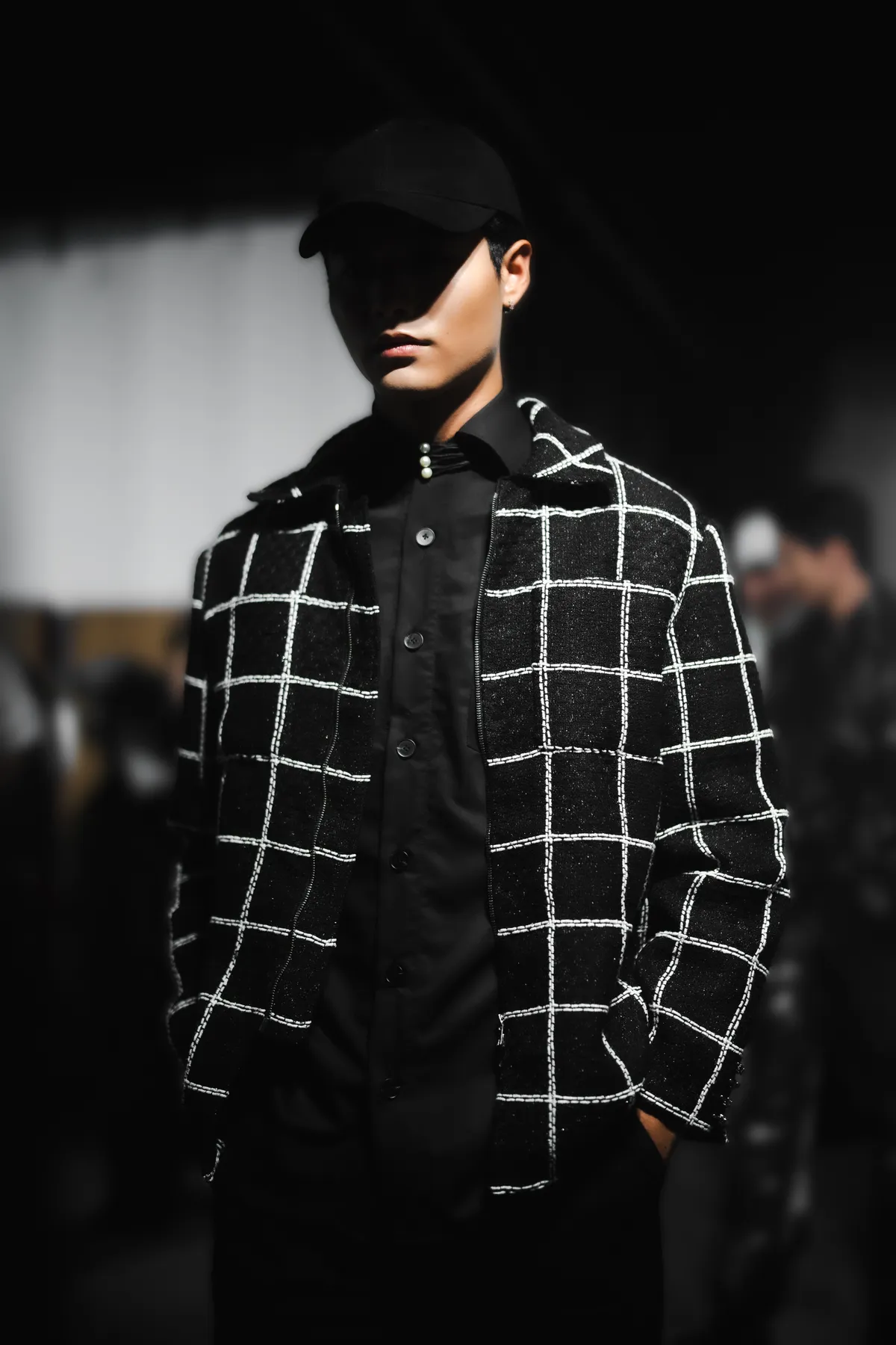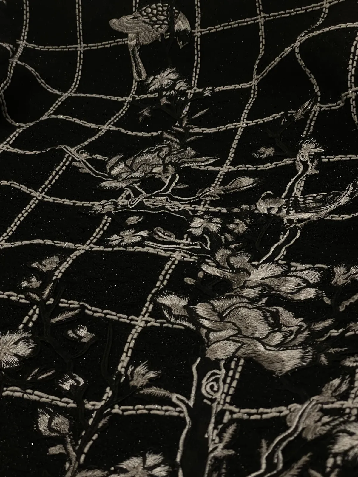 The designer draws inspiration from his mother’s hometown, Wuhu in Anhui, transforming the strength and fluidity of iron paintings into embroidery. The intricate stitching weaves between the hems, as if engraving the passage of time onto the fabric. The twill soft wool, interwoven with white cotton threads, mirrors the grey bricks and tiles of Hui-style architecture, layering a sense of classical and modern textures. The delicate embroidery and the fabric’s texture collide and merge, outlining the poetic tension between tradition and contemporary resonance, where beauty blooms from the contrast into harmonious elegance.