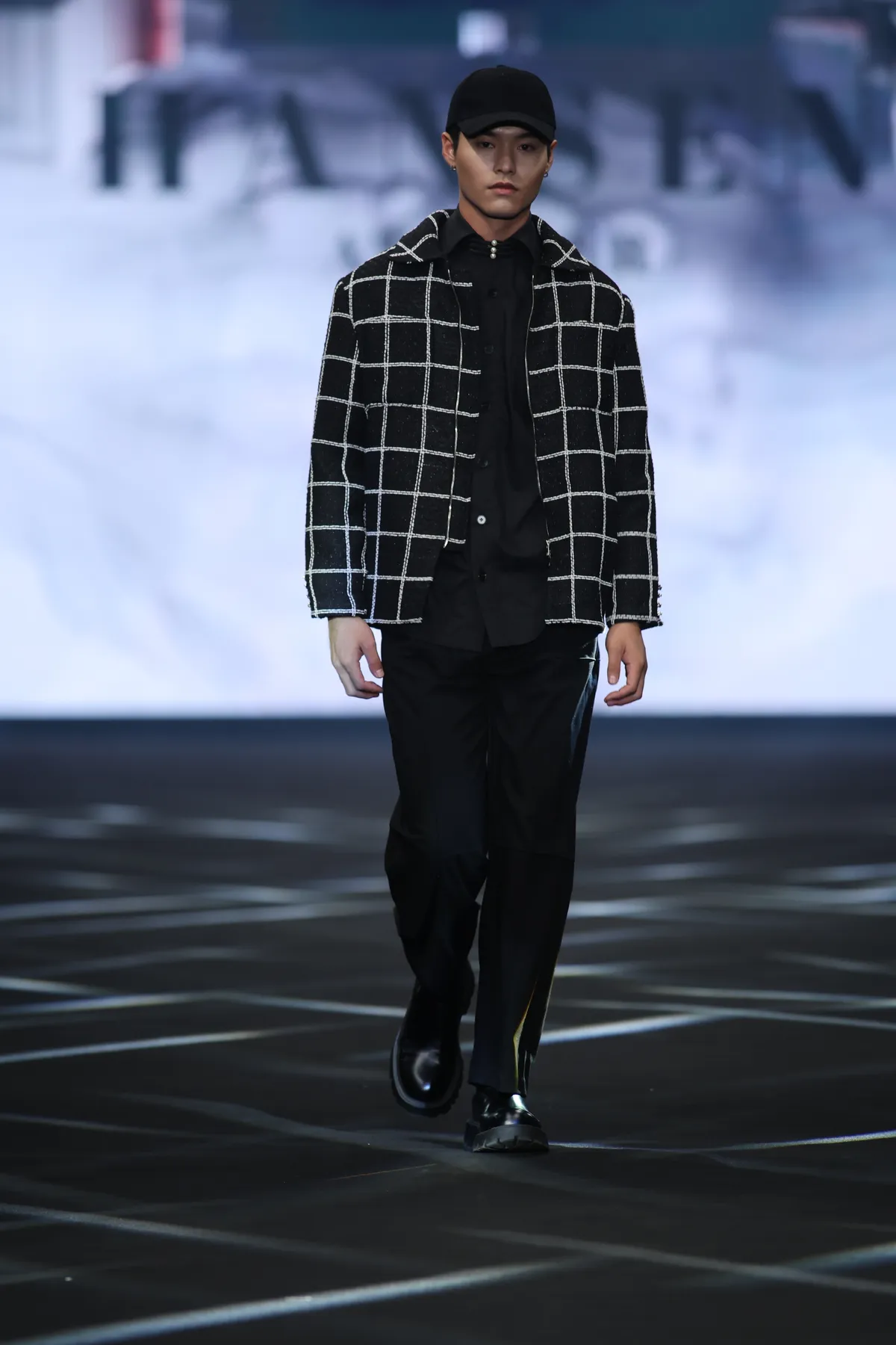 デザイナーは母の故郷、安徽省蕪湖からインスピレーションを受け、鉄画の剛健さと柔軟さを刺繍で再現しました。細やかな刺繍が裾に施され、まるで歳月が布に刻まれていくようです。斜紋ソフトウールに白い綿糸が交じり合い、徽派建築の青いレンガと黒い瓦のように、古典と現代が交錯する質感を重ね合わせています。刺繍の繊細さと織物の肌理が衝突し融合し、伝統と現代が共鳴する詩的な張力を描き出し、対立の中から調和の美が花開きます。