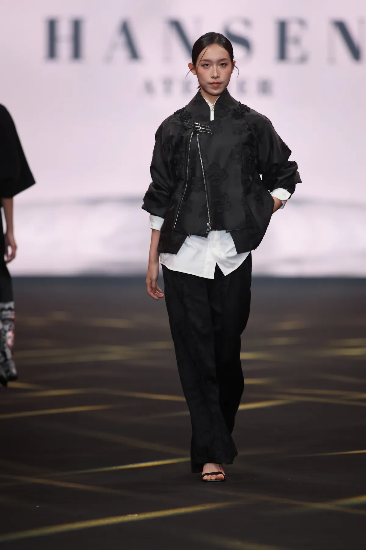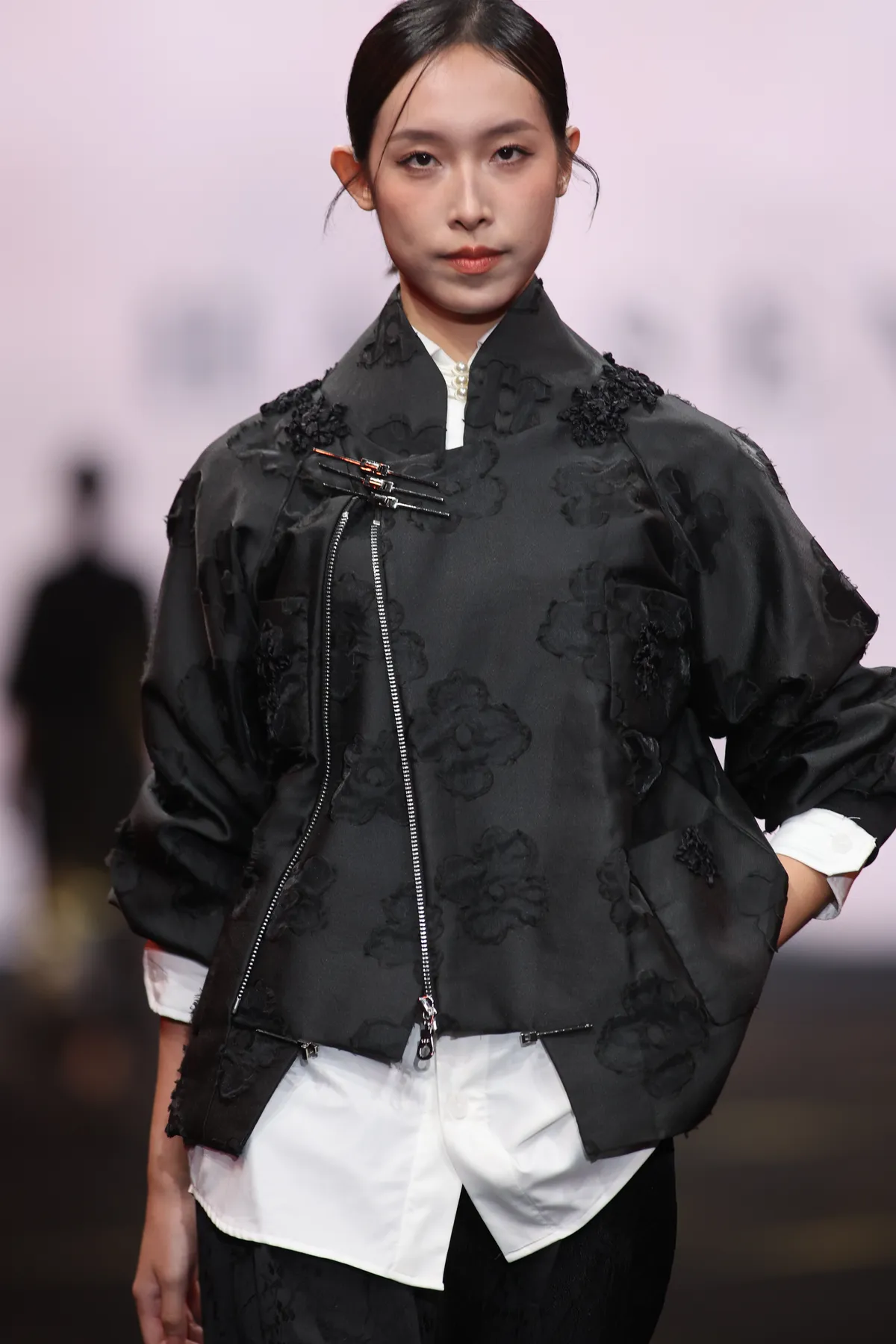 傳統大襟衫的右衽經過巧思轉化,以流暢的拉鍊勾勒出嶄新的輪廓。盤扣不再只是歲月的印記,而是鍍上金屬質感,在光影間閃耀當代風華。上衣層疊盤扣襯衫的細節,下身則輕展馬面裙的優雅垂墜,在傳統與現代之間游刃有餘,勾勒出東方服飾的嶄新可能,讓過往的風骨與當下的節奏共鳴於一襲衣裳之間。