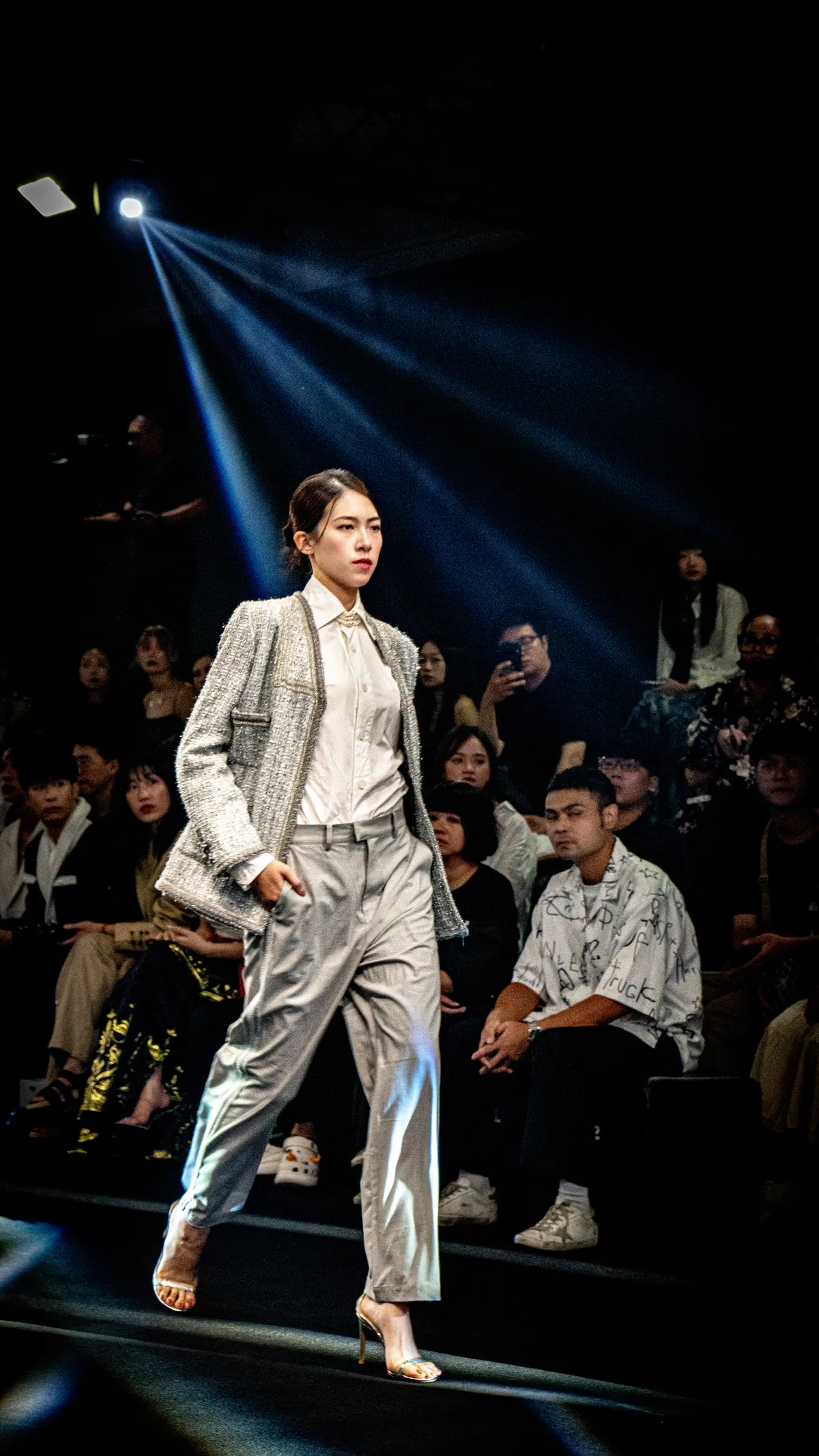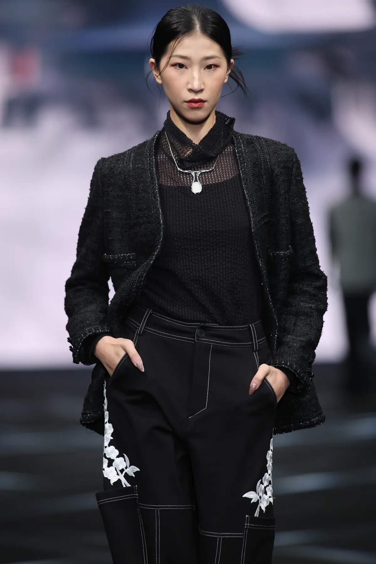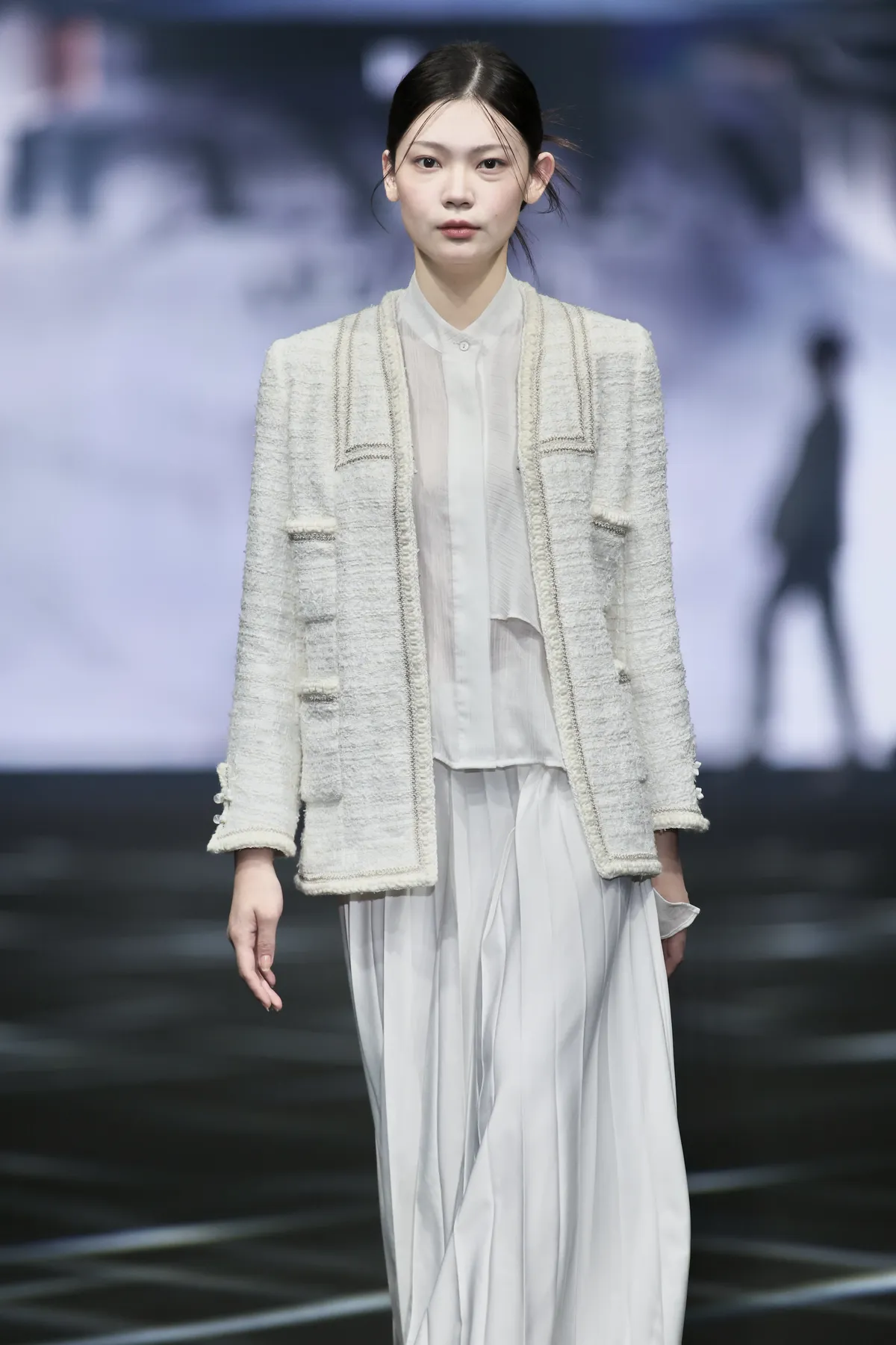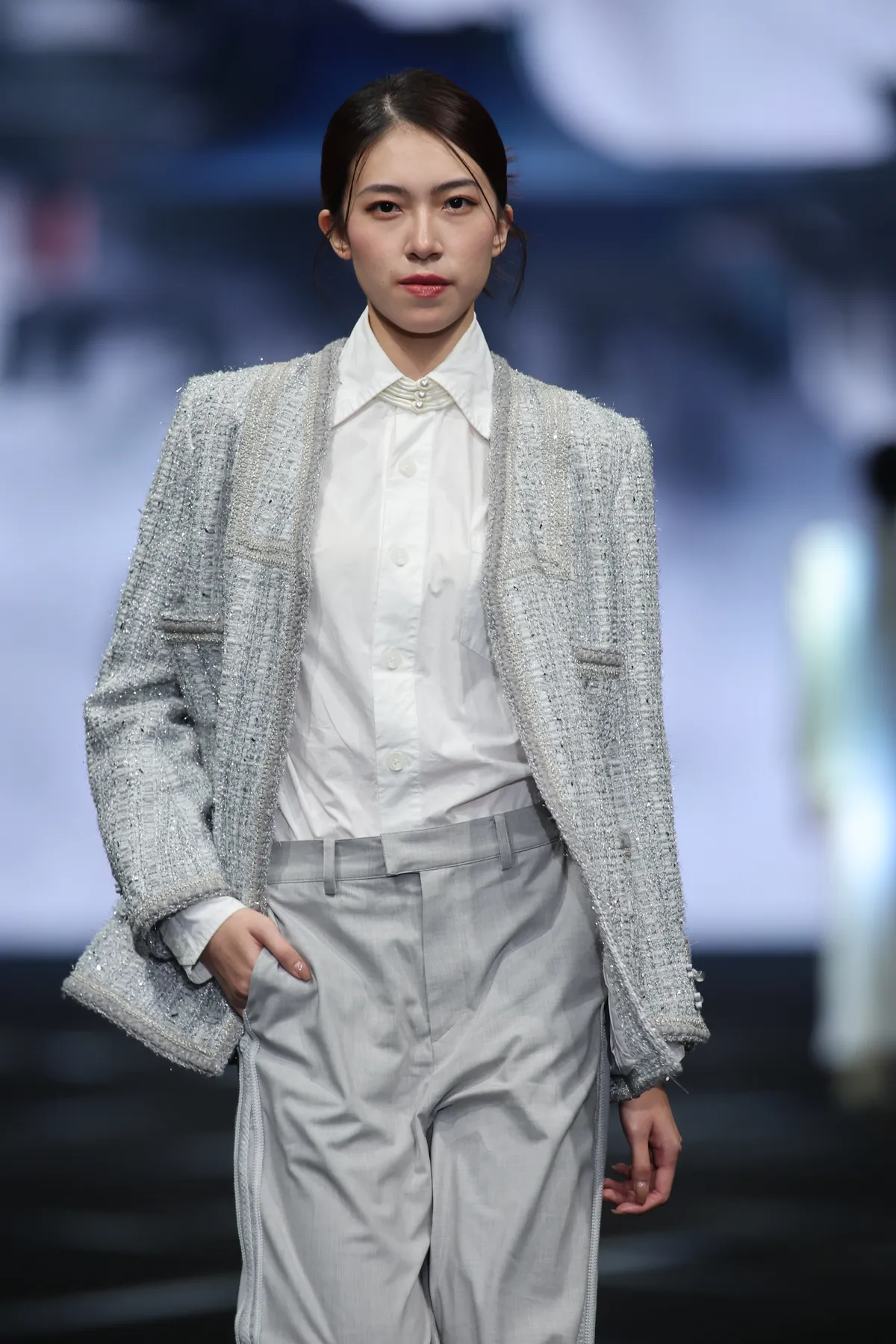クラシックなツイードジャケットに織りテープで優雅なシルエットを描き、袖口には中華風の伝統的な盤扣を施し、現代的と伝統的な要素が見事に融合したデザインです。