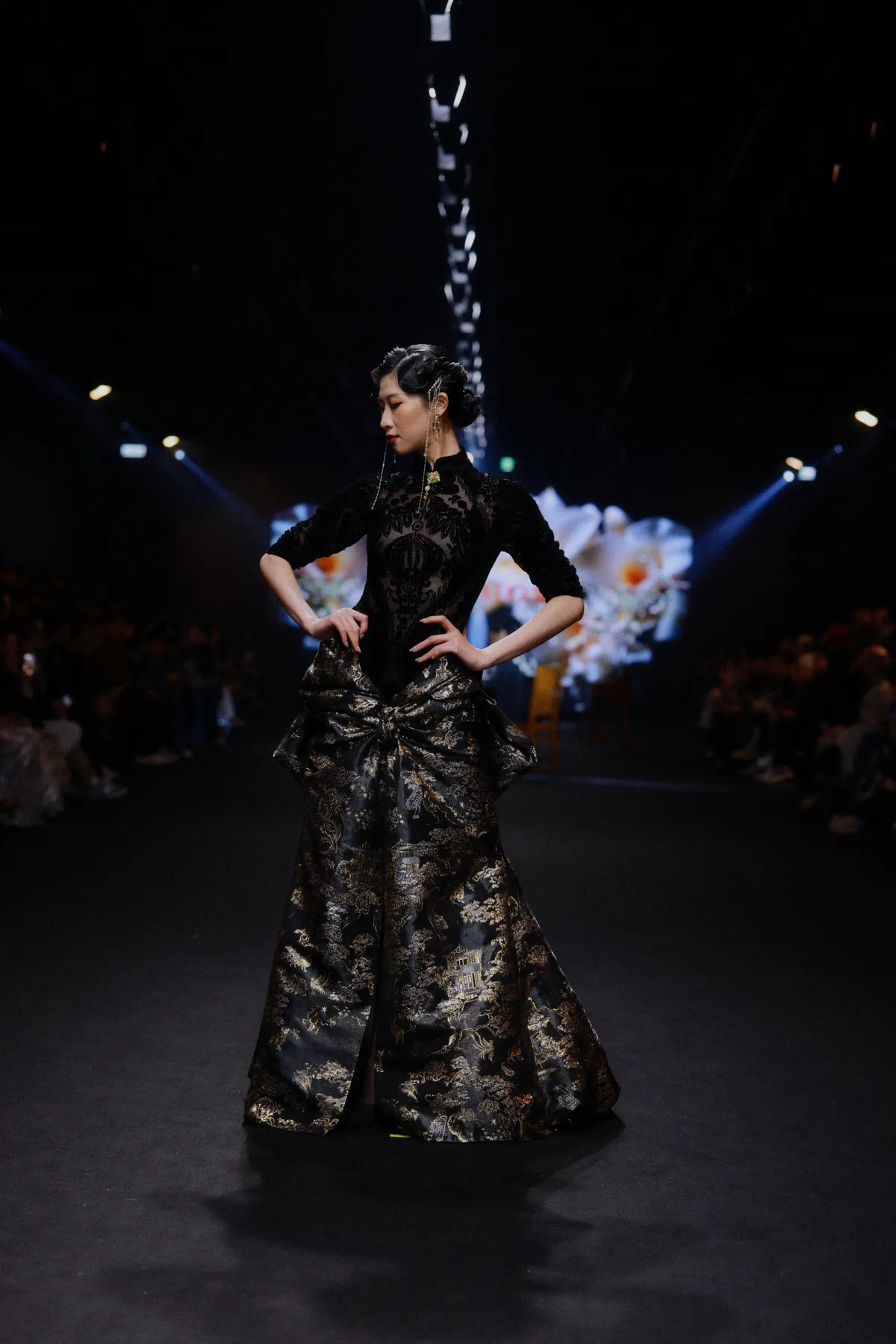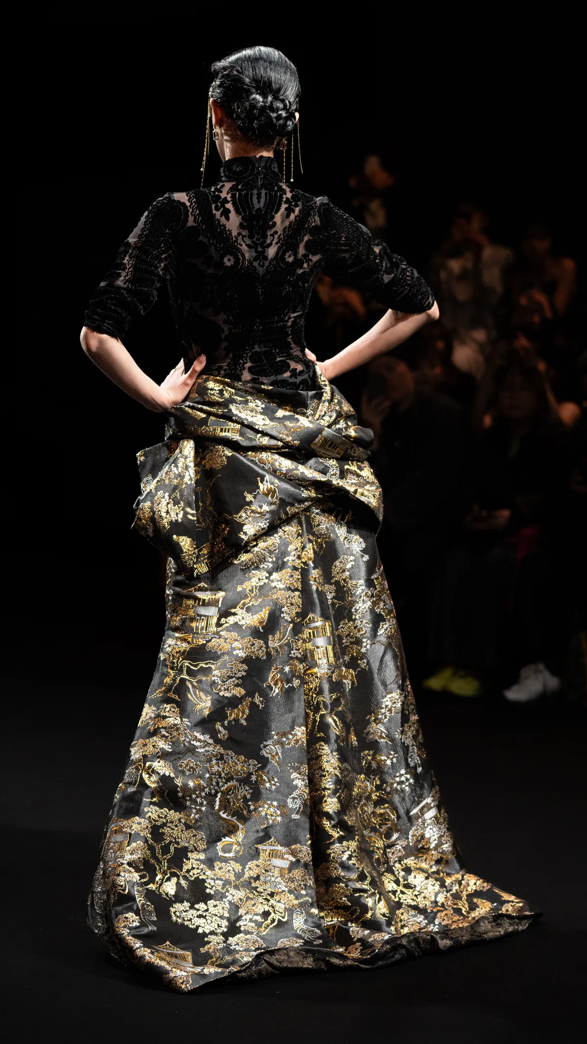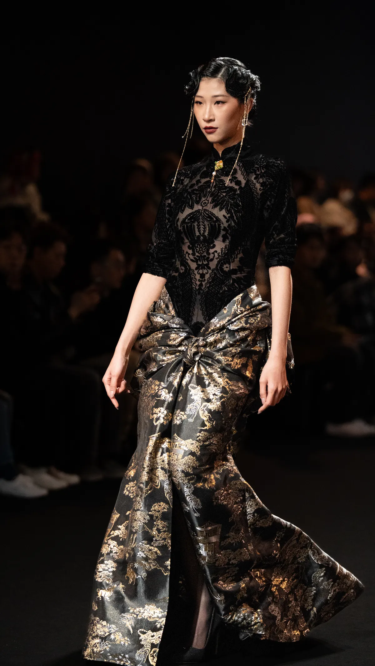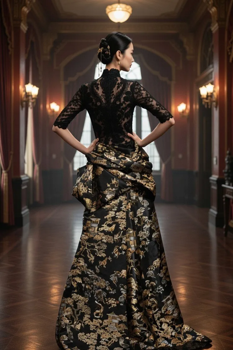 A formal gown crafted from black brocade satin, woven with floral motifs, architectural pavilions, and birds and beasts. The bodice is a velvet qipao, with the entire silhouette constructed using three-dimensional tailoring.