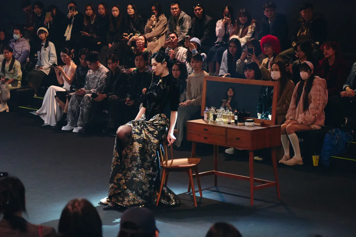 以黑色織錦緞製作的禮服,布料織有花草、樓閣與鳥獸等圖樣,上身為絲絨旗袍,整體以立體裁剪完成。