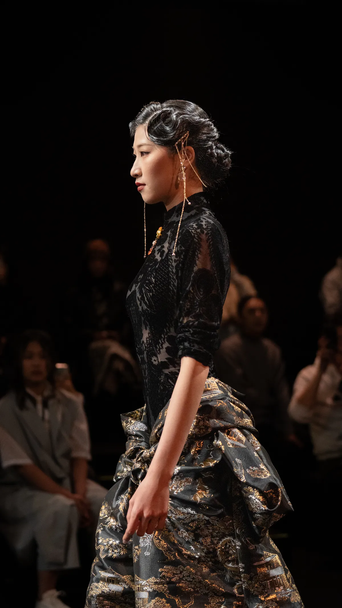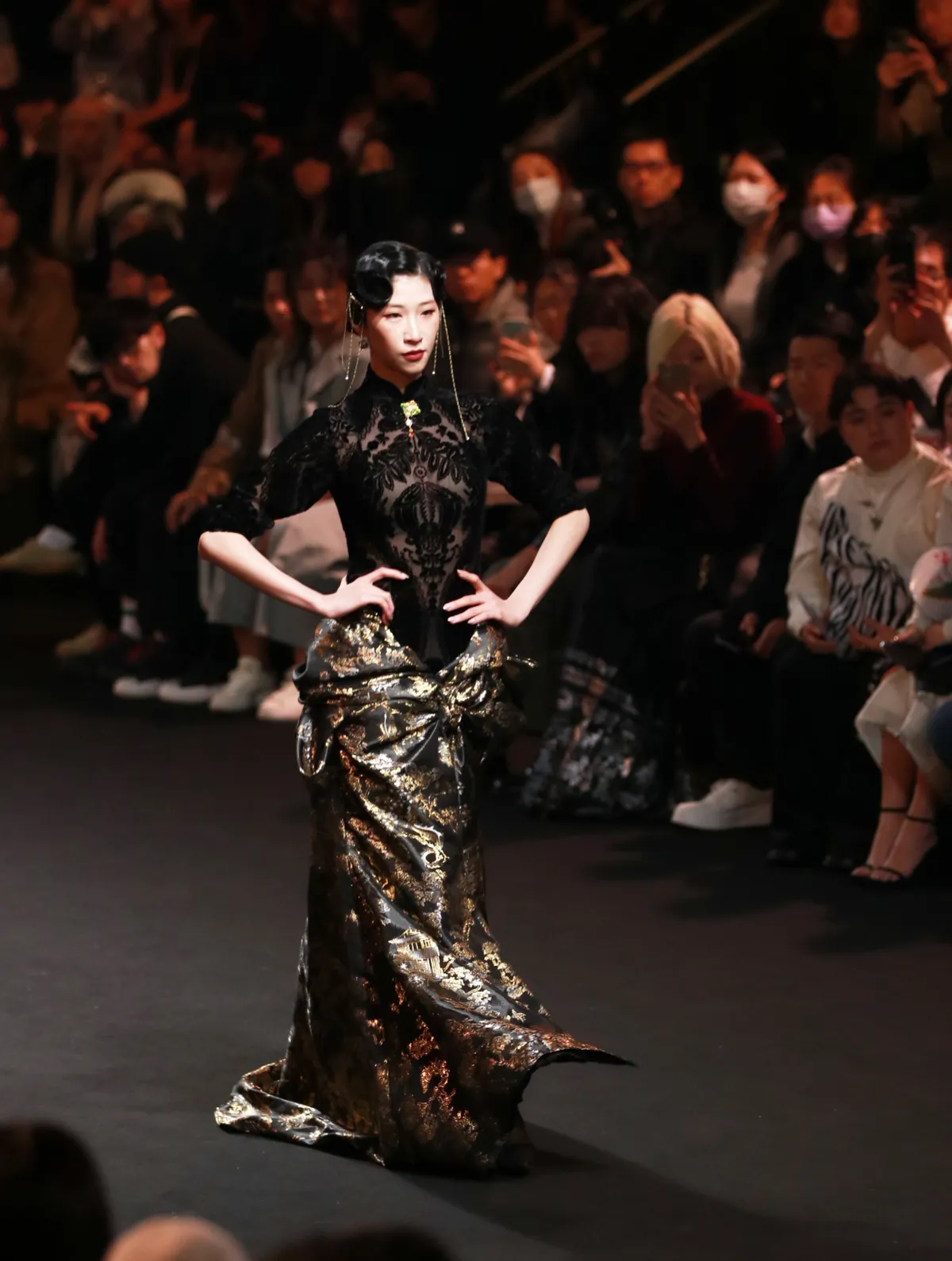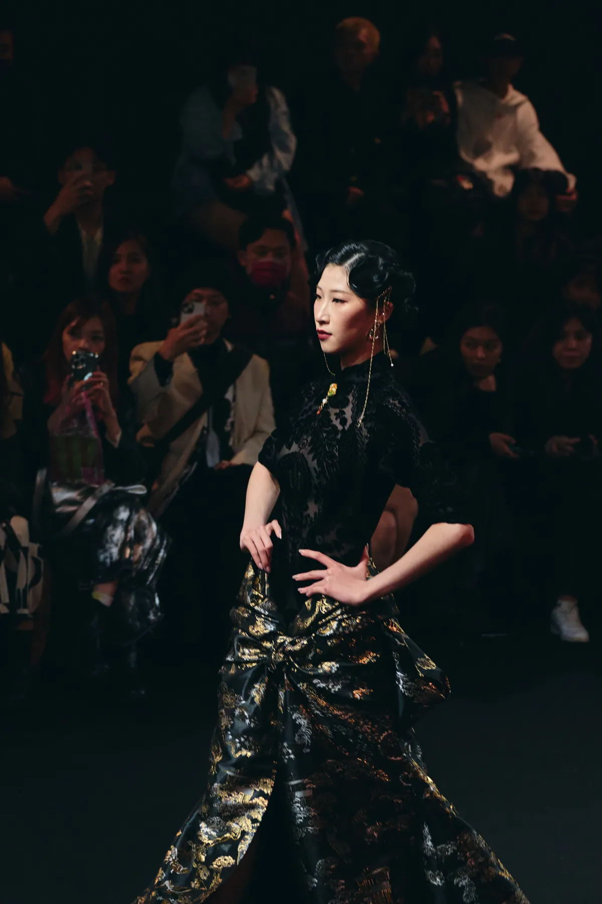 黒の織錦サテンで仕立てたドレスで、花草や楼閣、鳥獣の模様が織り込まれている。上半身はベルベットの旗袍で、全体は立体裁断により構築されている。