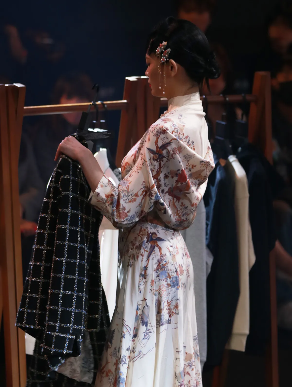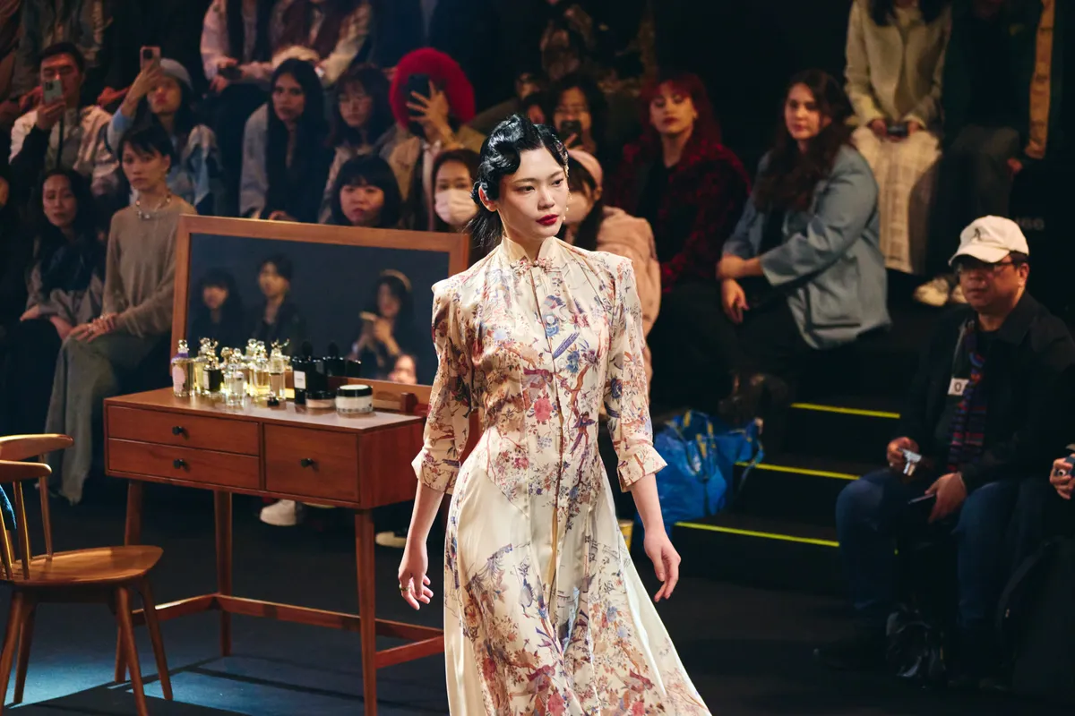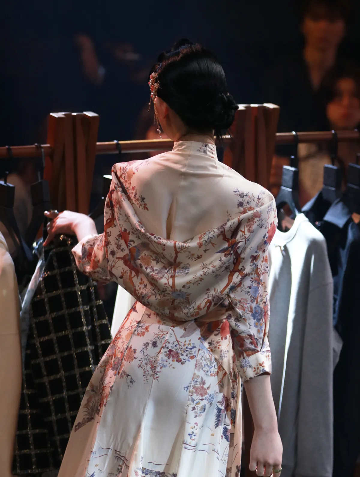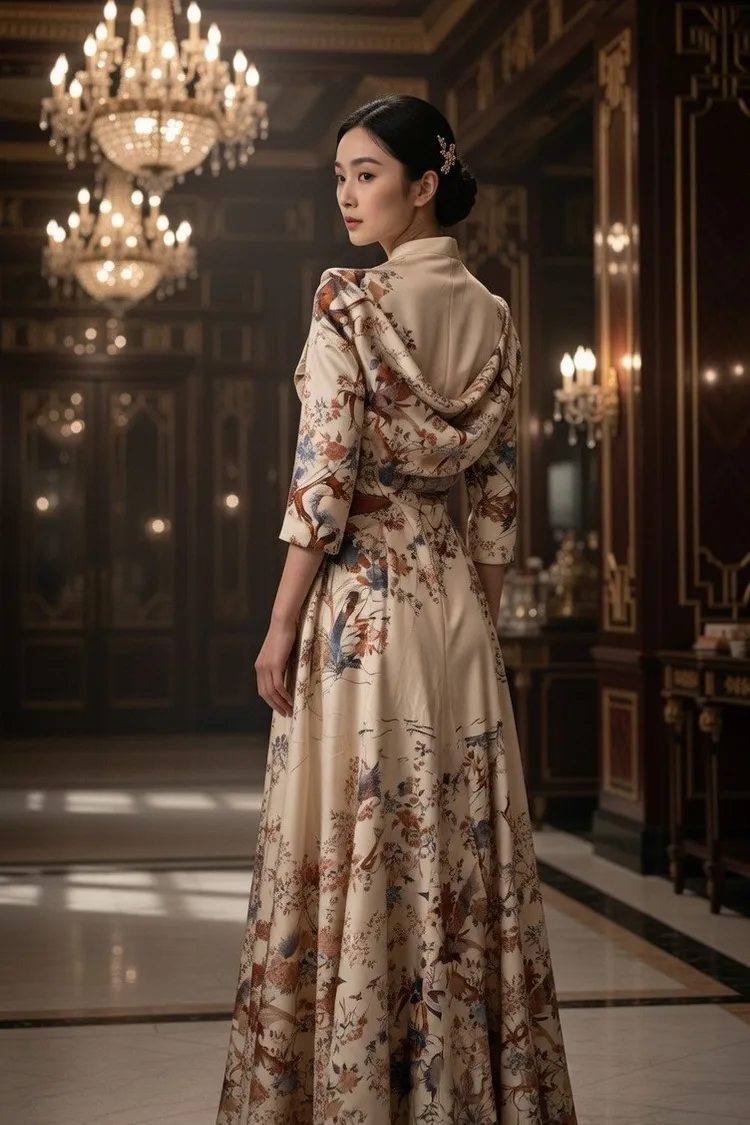 以100%蠶絲製作的印花旗袍洋裝,後背以立體裁剪製作出垂墜效果,並以手工盤扣做裝飾,需要量身訂製。