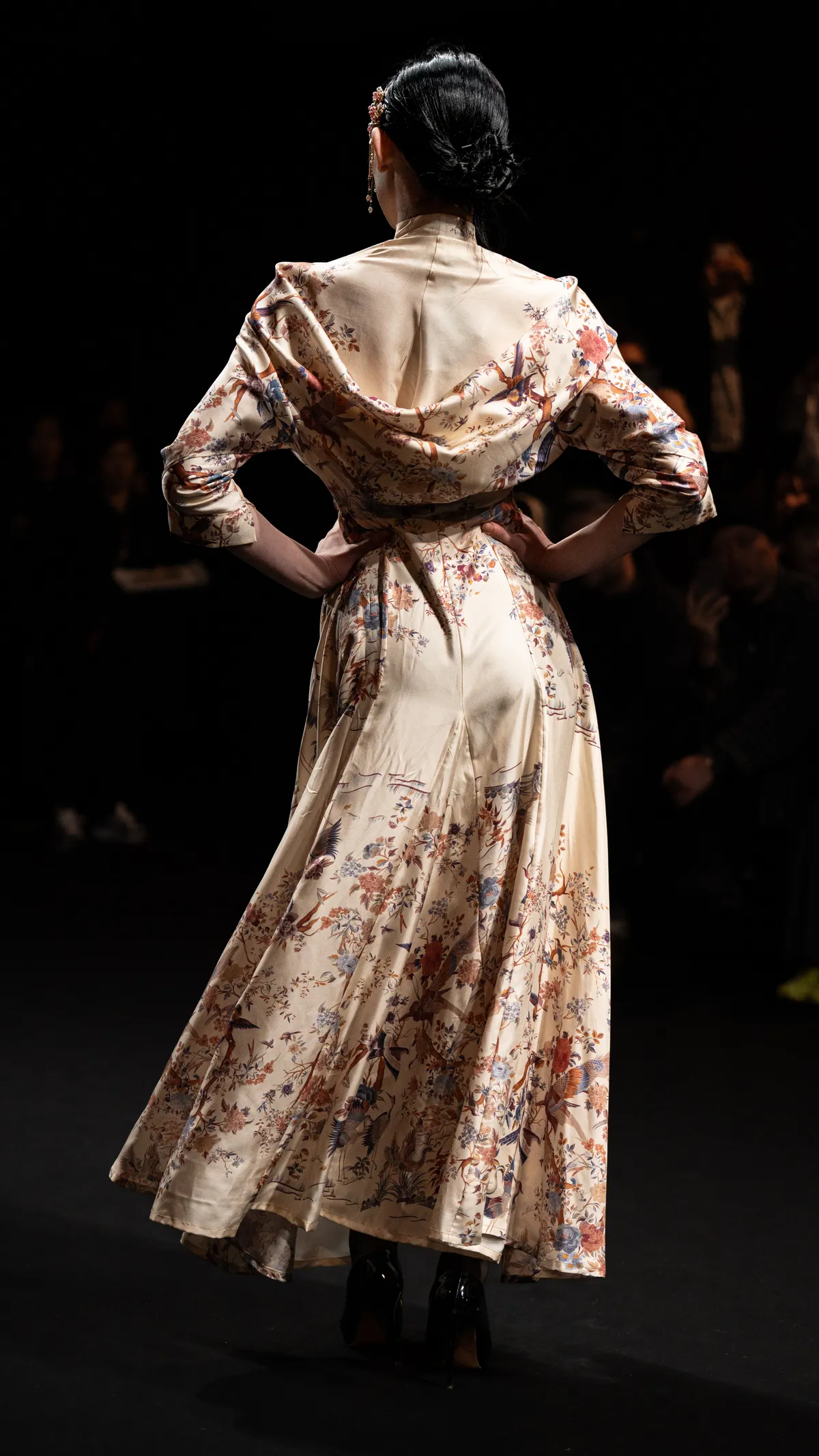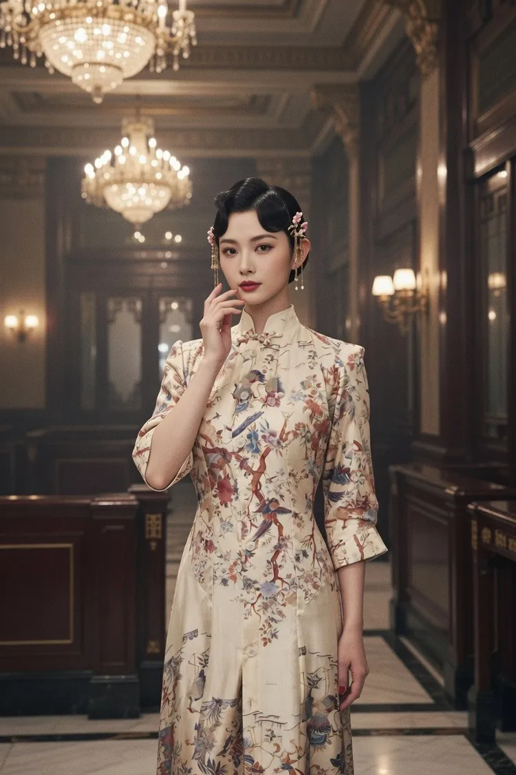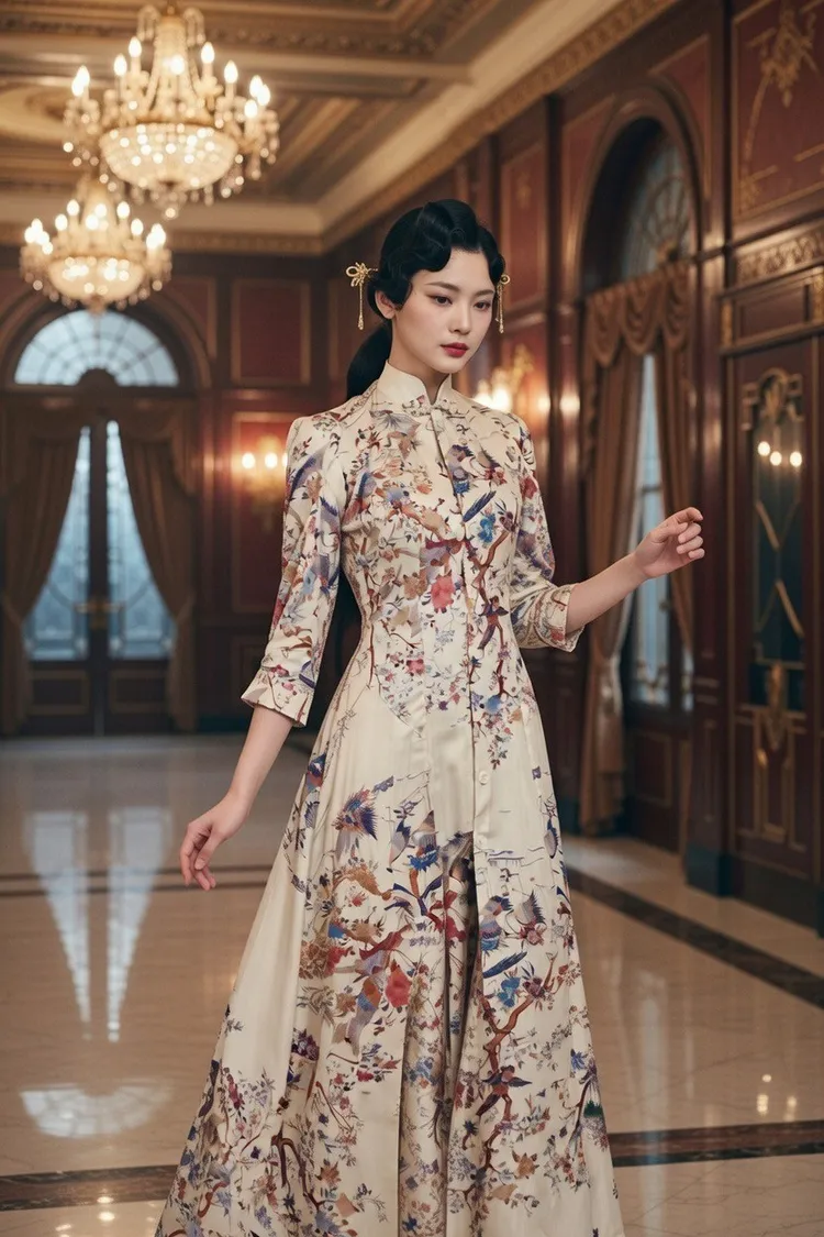 100%シルクのプリント旗袍ドレスで、背面は立体裁断によりドレープ感を生み出し、手作りの盤扣で装飾しています。オーダーメイドのみ対応。