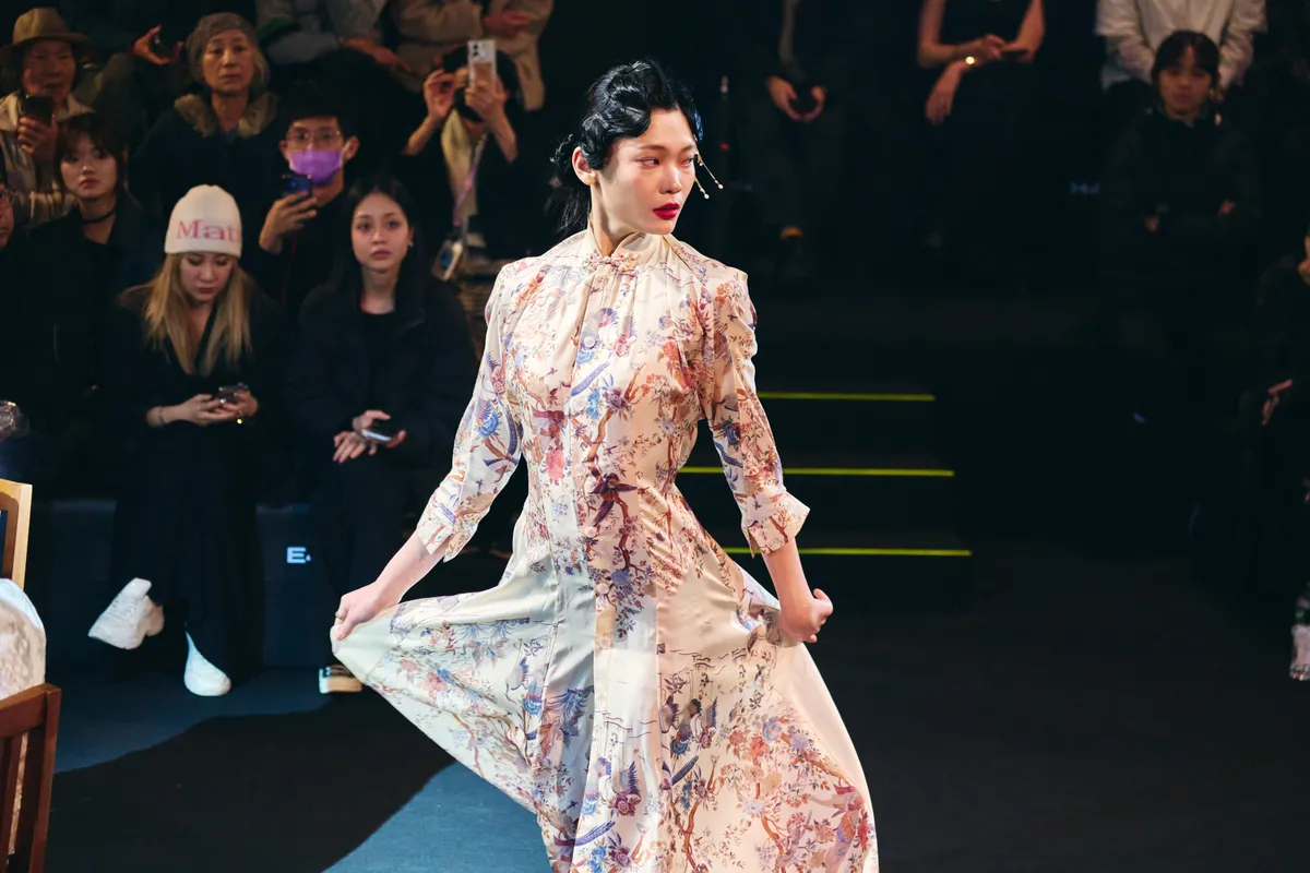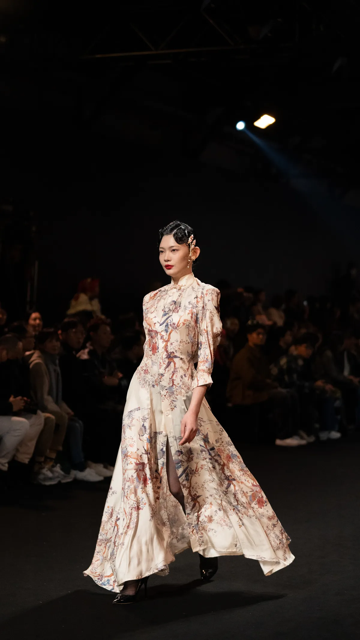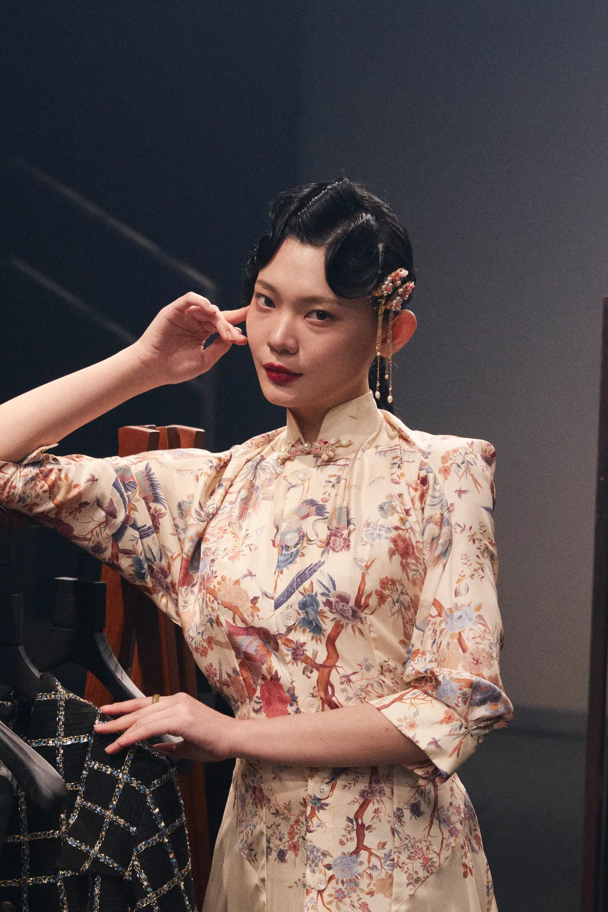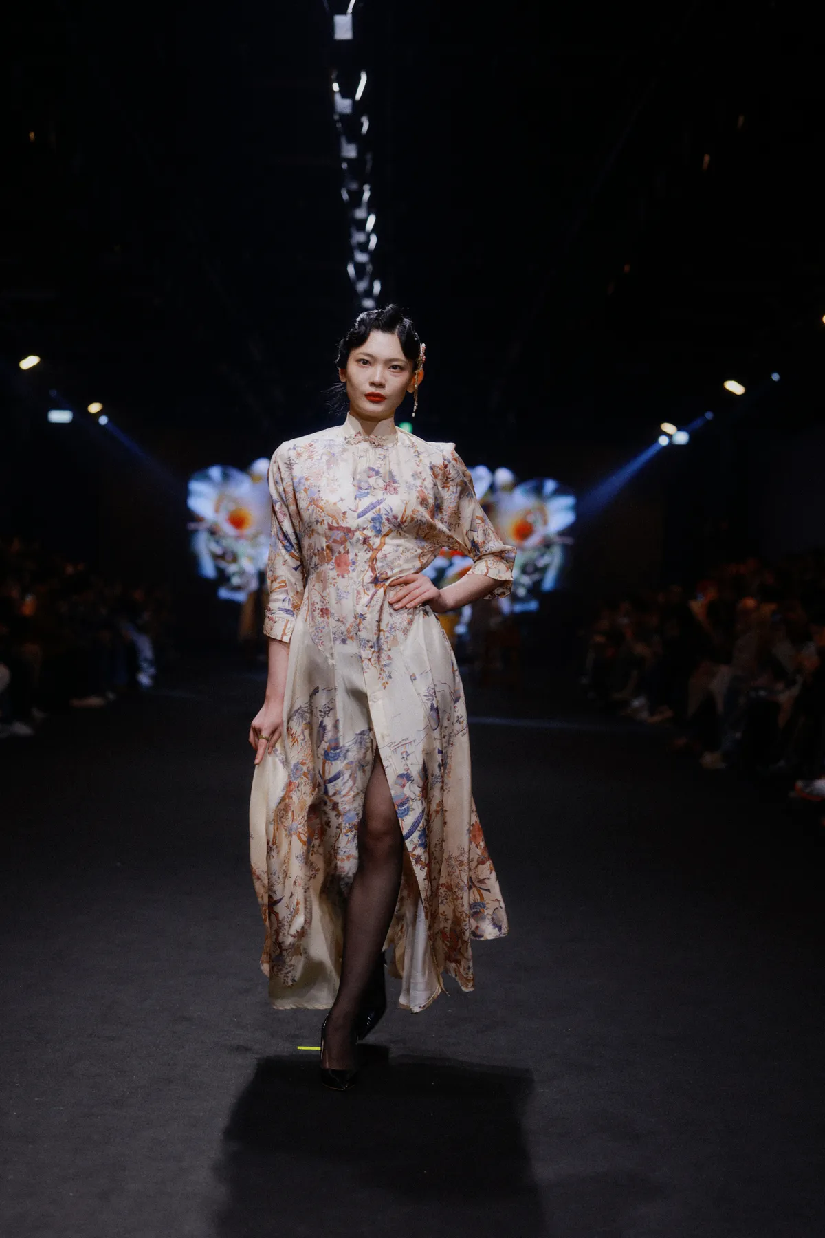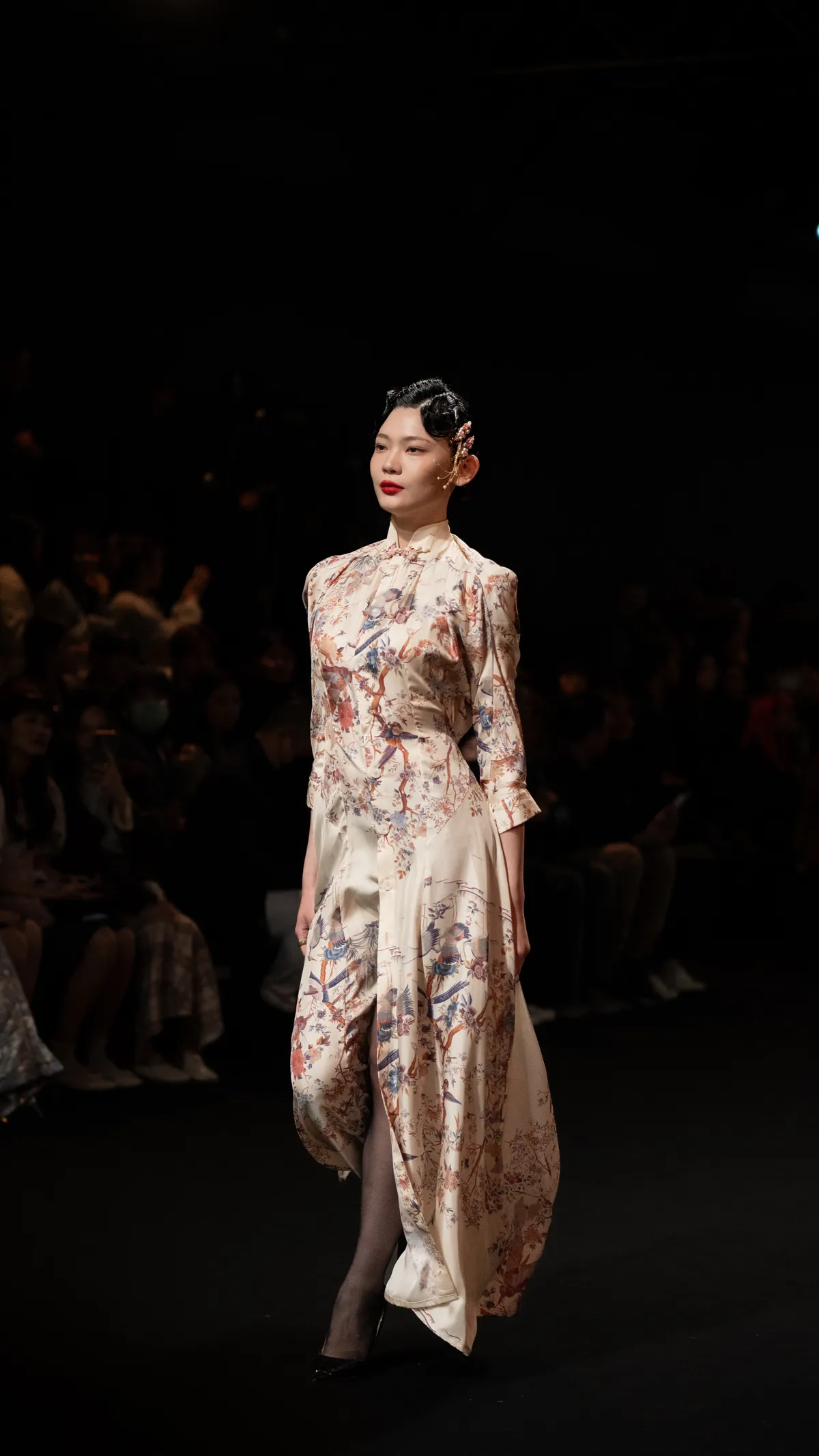 A 100% silk printed qipao dress, with a draped effect created through tailored back darts, adorned with handmade frog buttons. Made-to-measure only.