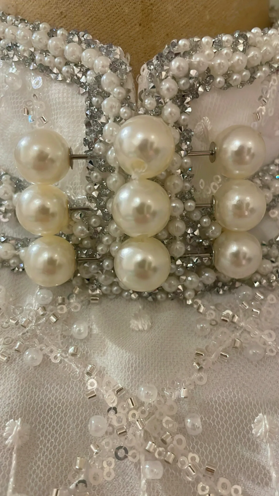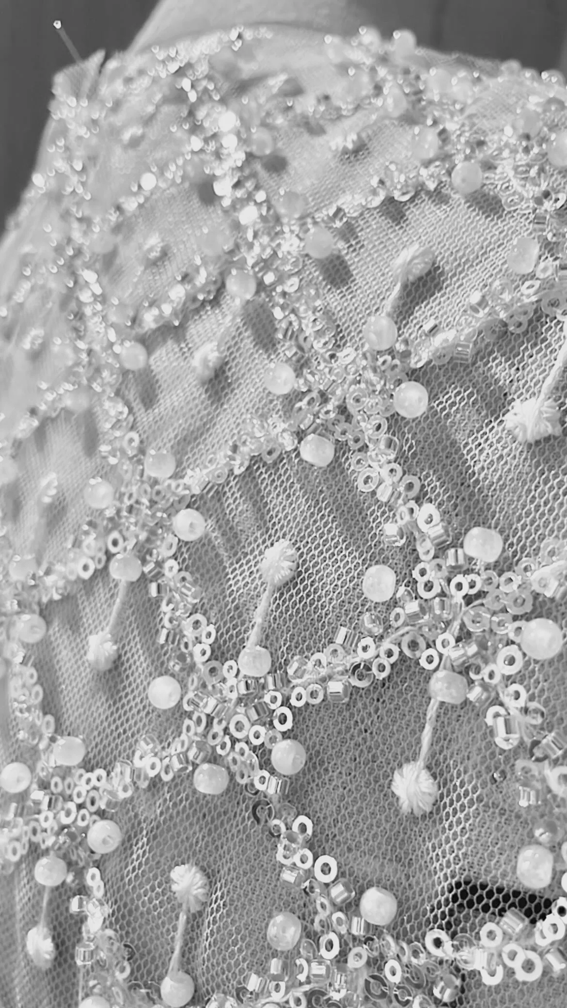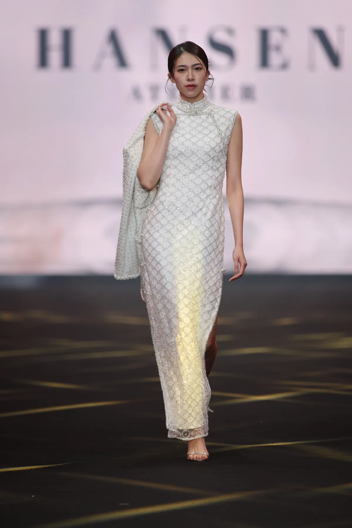 旗袍,是品牌精神的映照,承載著東方優雅的靈魂。本季,絲綢內裡如水般柔滑貼合肌膚,外層覆以鑲滿珍珠與鑽石的輕盈網紗,閃爍如波光粼粼的長江,流轉著光影與詩意。珍珠似水滴凝結,璀璨如晨曦映照水面,讓每一步律動間,都彷彿映照江岸的呢喃,輕輕訴說時間沉澱的靜謐與華美。