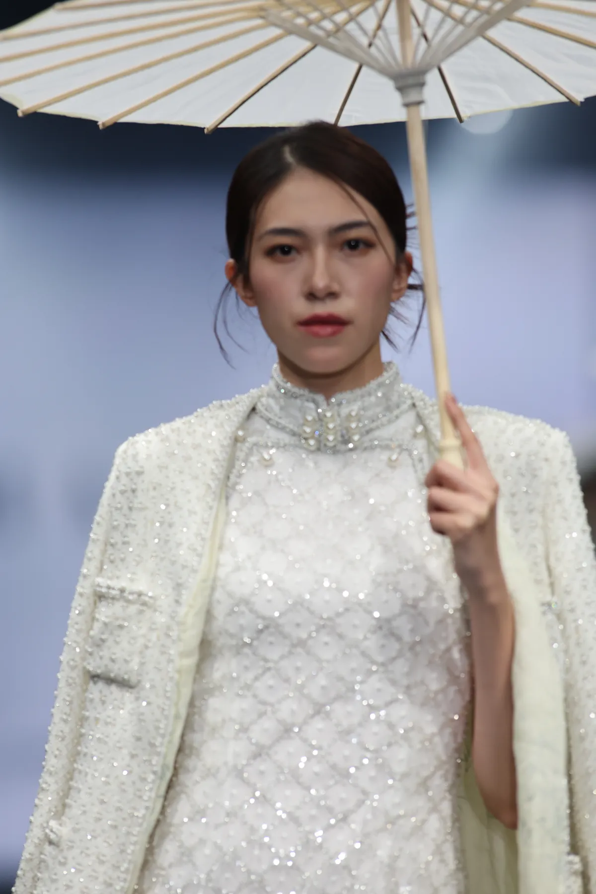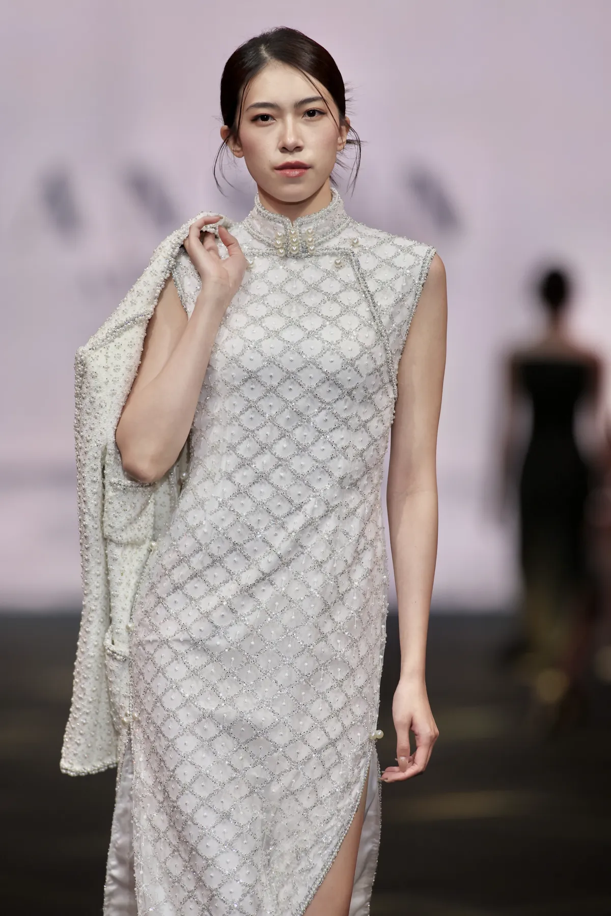 The qipao is the embodiment of the brand’s spirit, carrying the essence of Eastern elegance. This season, a silk lining flows smoothly against the skin, like water in its purest form. Delicately layered with a sheer netting adorned with pearls and crystals, it shimmers like the rippling surface of the Yangtze River, reflecting light and poetry in motion. Pearls glisten like dewdrops suspended in time, radiant as the morning sun upon tranquil waters. With every graceful movement, whispers of the riverbanks unfold, softly telling a tale of time’s quiet refinement and beauty.